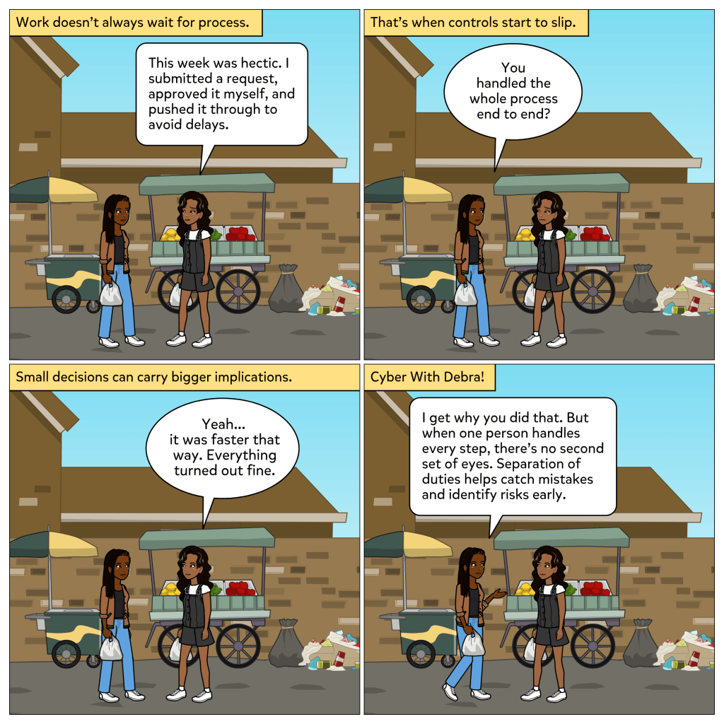 Instead of one person handling everything, responsibilities are divided. One person may request a change, another approves it, and someone else executes it.
